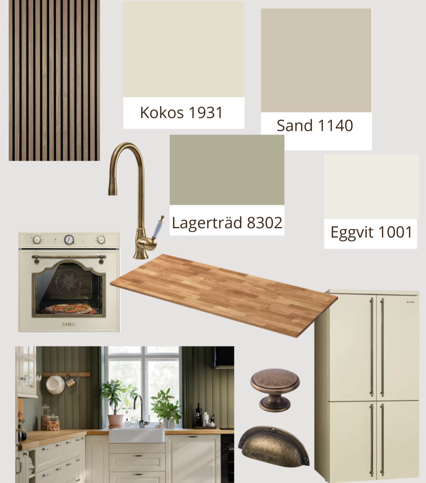 A mood board shows suggestions and tips for colors with NCS codes, furniture, kitchen accessories, bathroom furnishings, etc. It is used to get an overview of what goes together and to give tips on what fits into the wishes and budget you have stated. The picture shows an example of a mood board for a kitchen with warm, light beige tones.