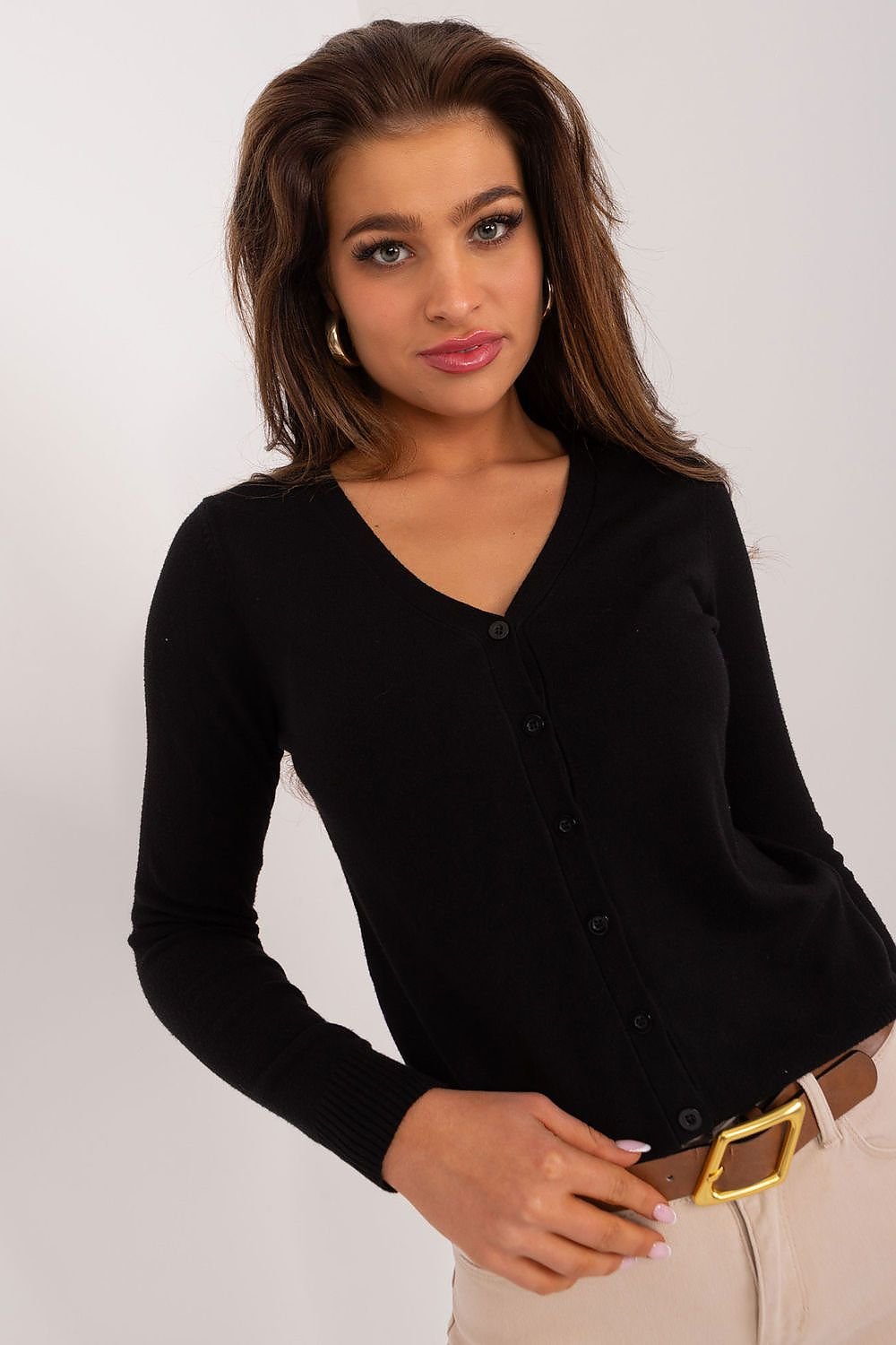 Imagine a sweater that you want to wrap yourself in every morning before going to work. It's a reliable companion for your daily outfits, providing both comfort and elegance. It is a button-down sweater that will easily fit into a variety of situations and atmospheres. Its dominant pattern is one of simplicity and elegance. The smooth material stands out with its delicate texture, adding subtlety and class to the sweater. As for the material, the dominant material is soft and pleasant to the touch acrylic, which provides not only wearing comfort, but also durability. The length of this sweater is standard, blending perfectly with various styles. The long sleeve allows you to warmly cover your hands on colder days, while maintaining freedom of movement. Its heart neckline adds lightness and subtlety, allowing you to elegantly display the edges of your shirt or accessories you may choose underneath. All in all, this sweater is an excellent choice for everyday styling for work, guaranteeing both comfort and a stylish look.