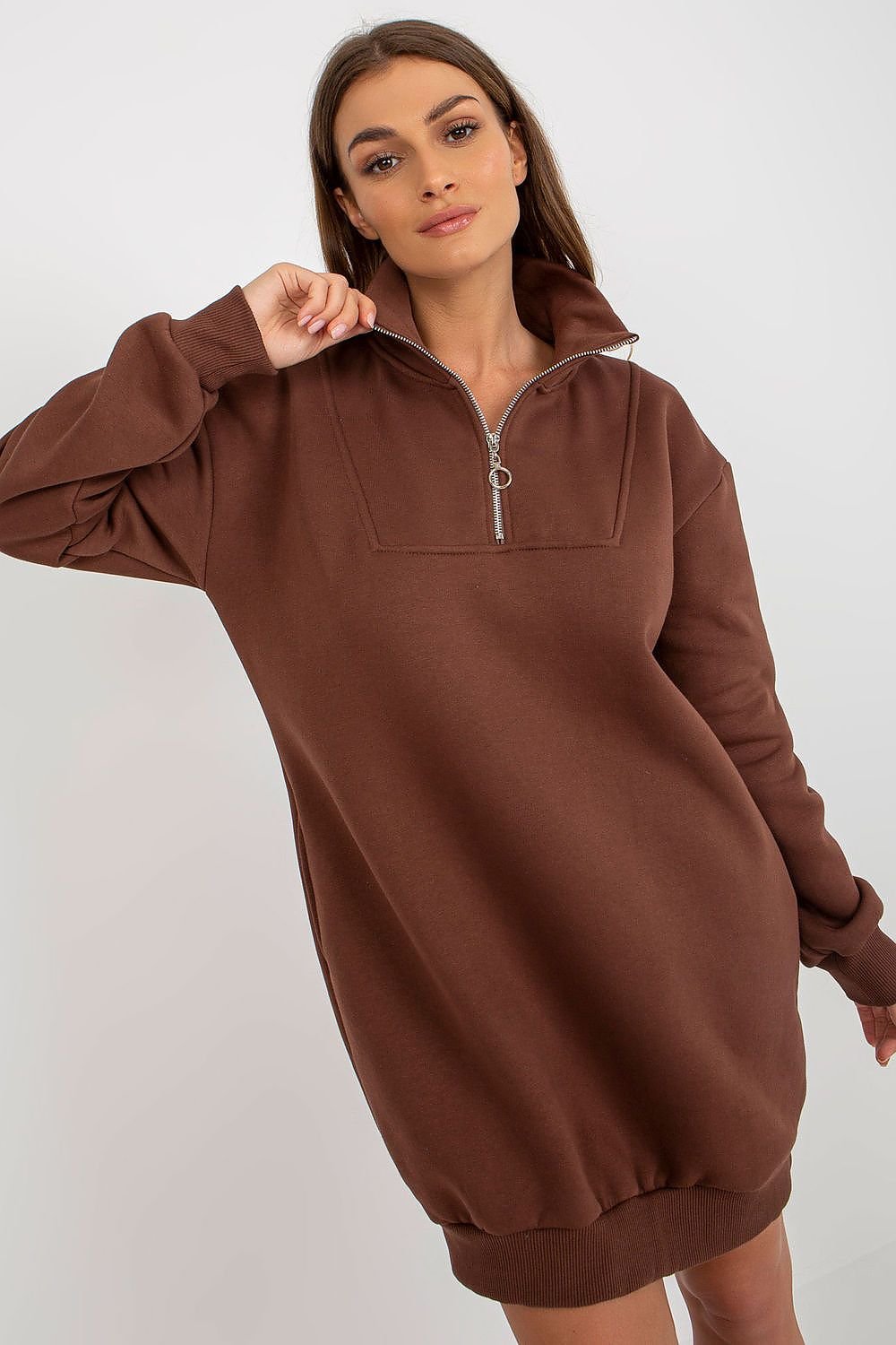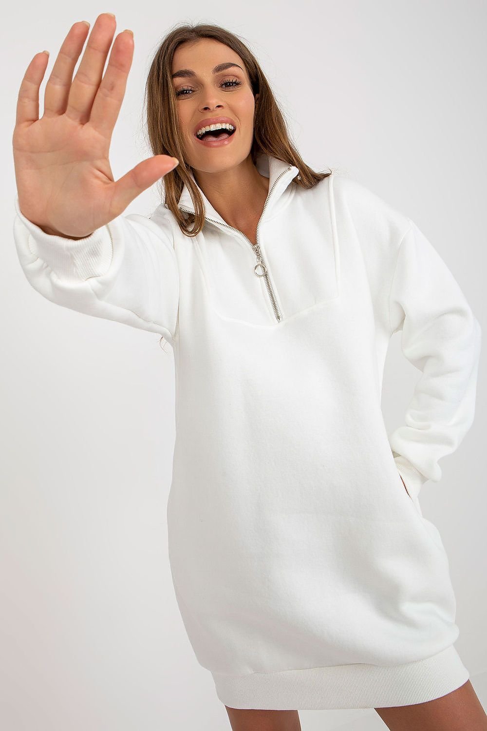 This sweat dress is a combination of comfort and style in one. Made of smooth cotton material, it is an ideal choice for everyday wear. The dress has long sleeves that will keep you warm on colder days. A stand-up collar with a zipper closure adds a modern touch. The slip pockets on the sides are a practical element that allows you to store small items or hide your hands on colder days. The loose fit makes the dress loose and comfortable, perfect for relaxed days, walks or meetings with friends. It's also a dress that will add comfort and casualness to your everyday style.
