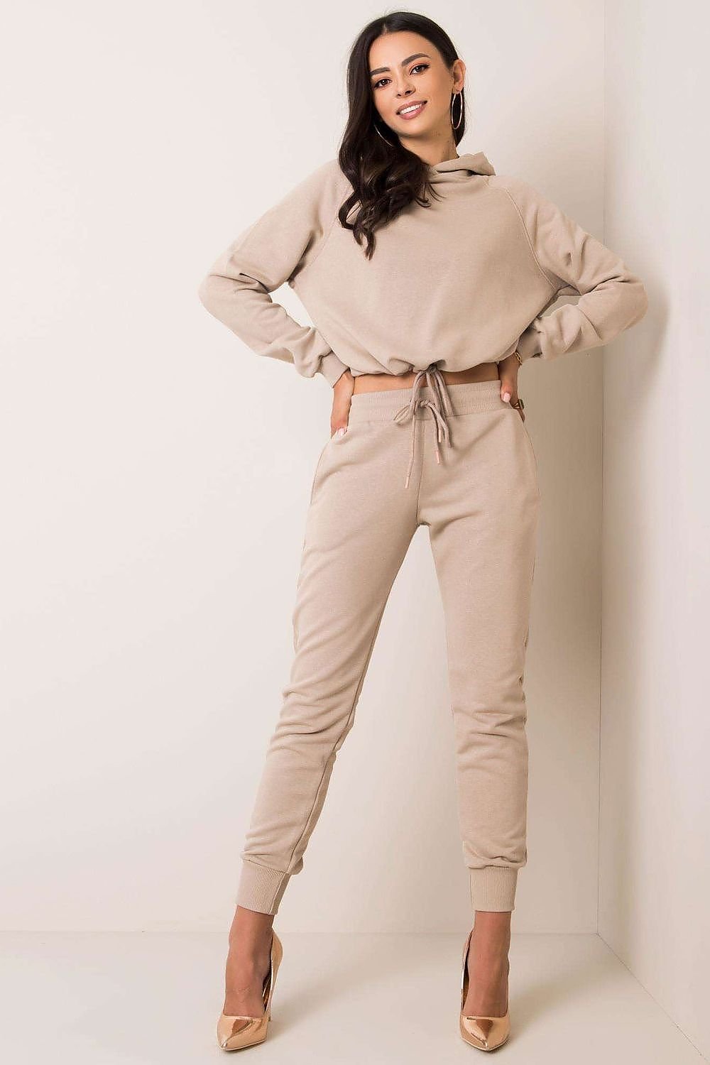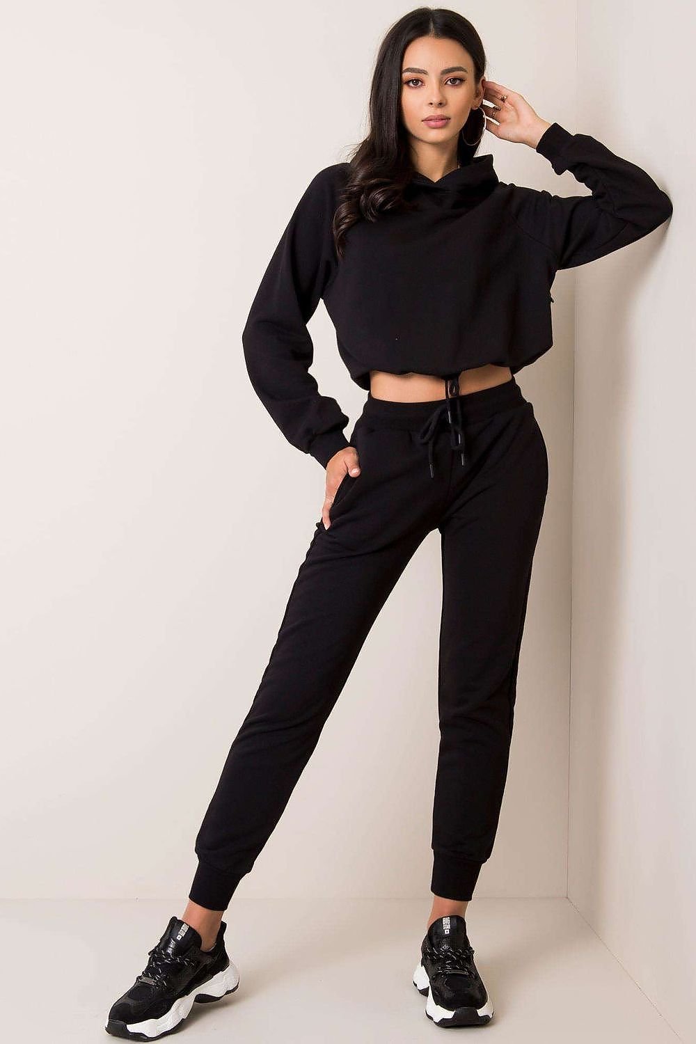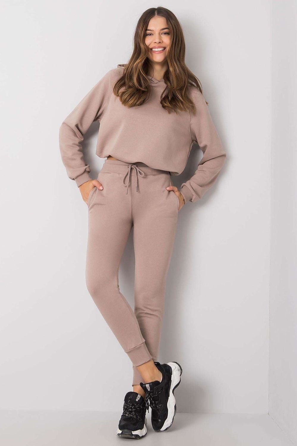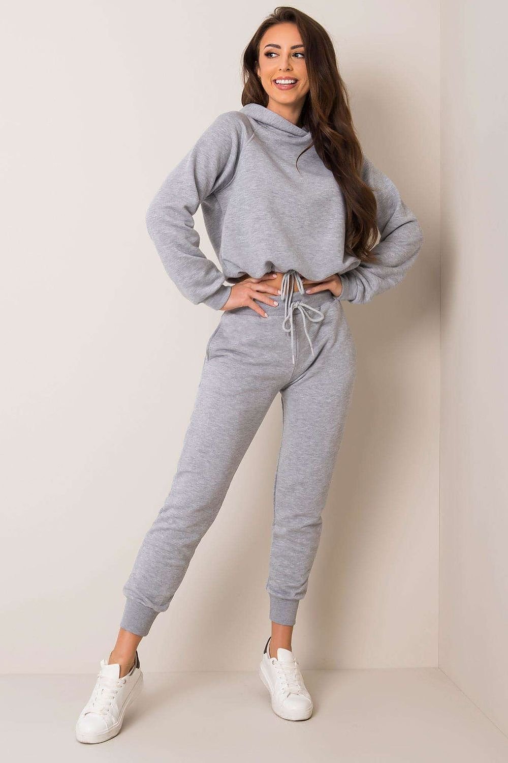 A sweatshirt set consisting of a sweatshirt and pants. Shorter sweatshirt with long sleeves and a hood. Long pants with a more fitted cut, with a tie at the waist and slip pockets.