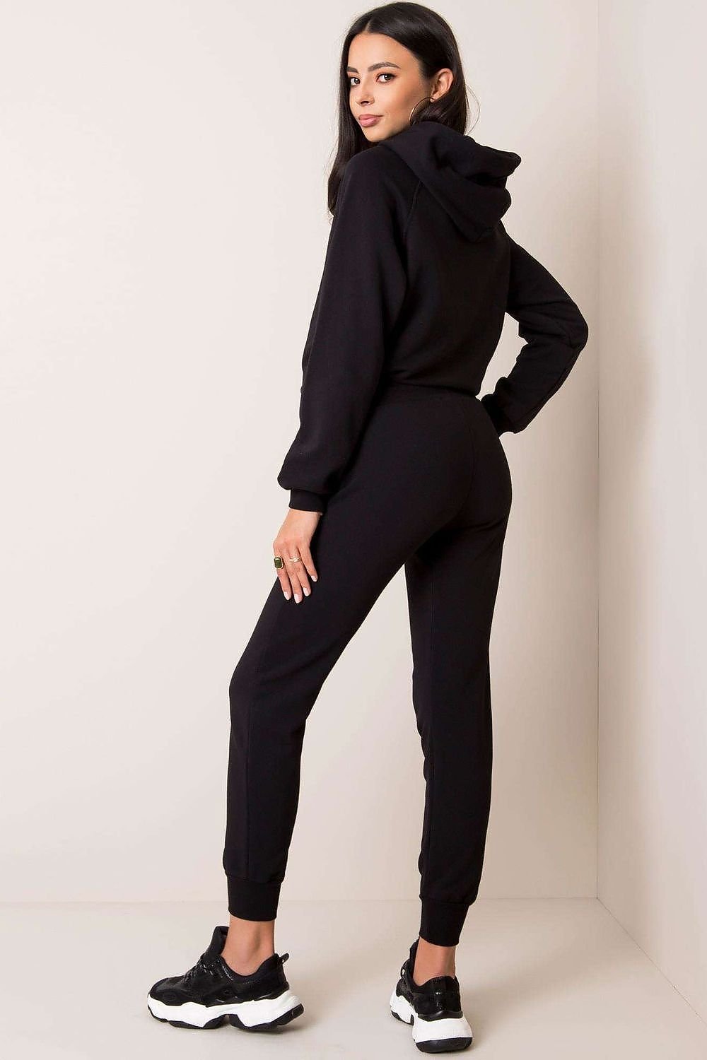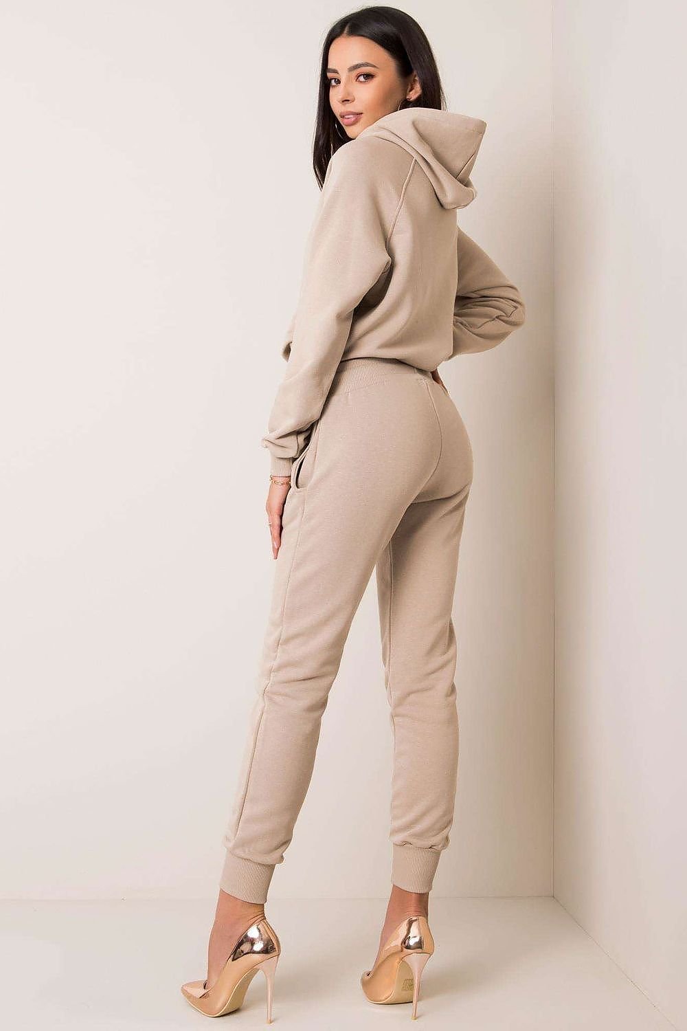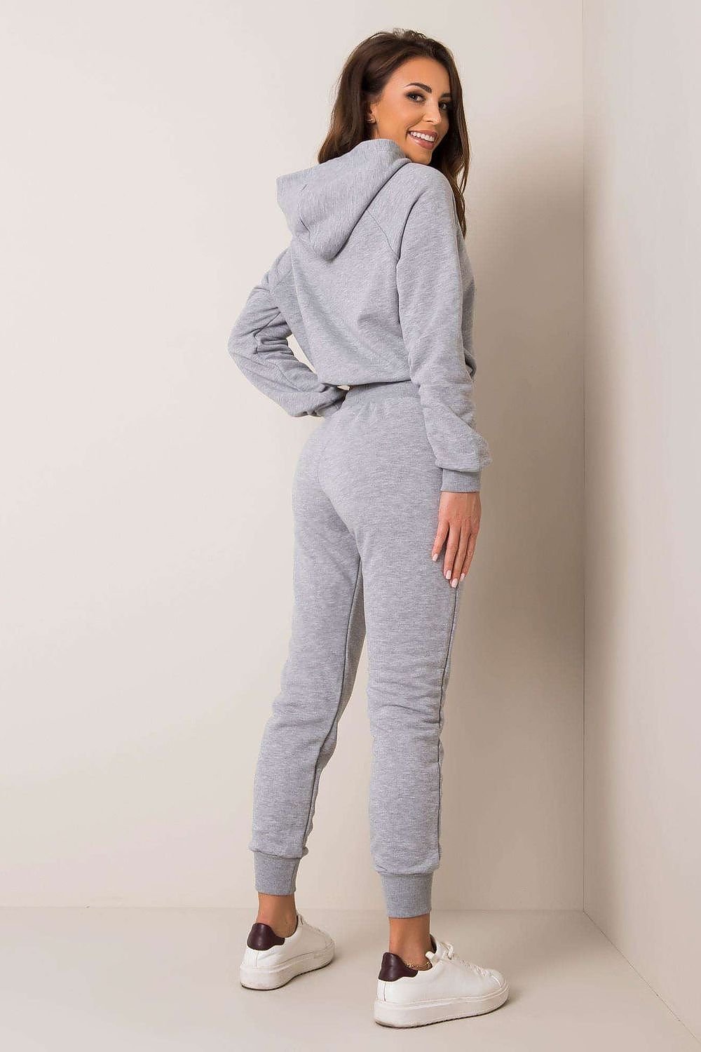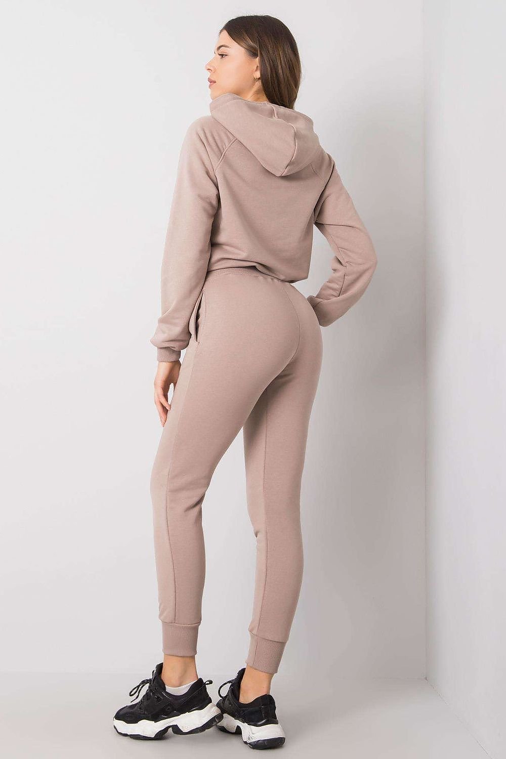 A sweatshirt set consisting of a sweatshirt and pants. Shorter sweatshirt with long sleeves and a hood. Long pants with a more fitted cut, with a tie at the waist and slip pockets.