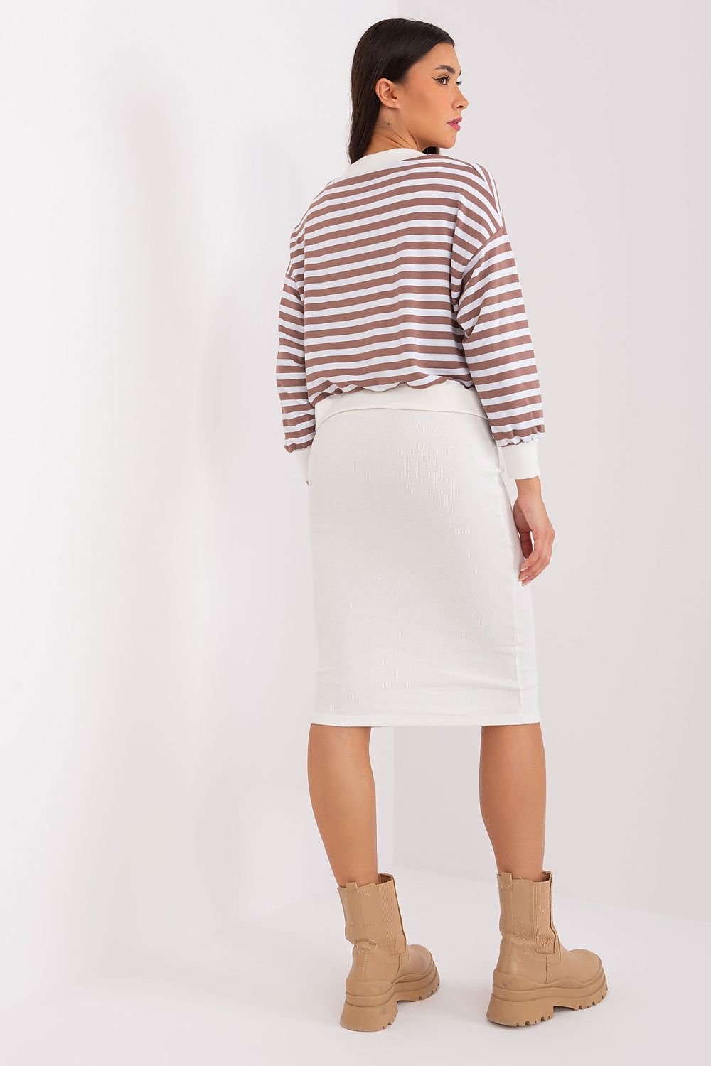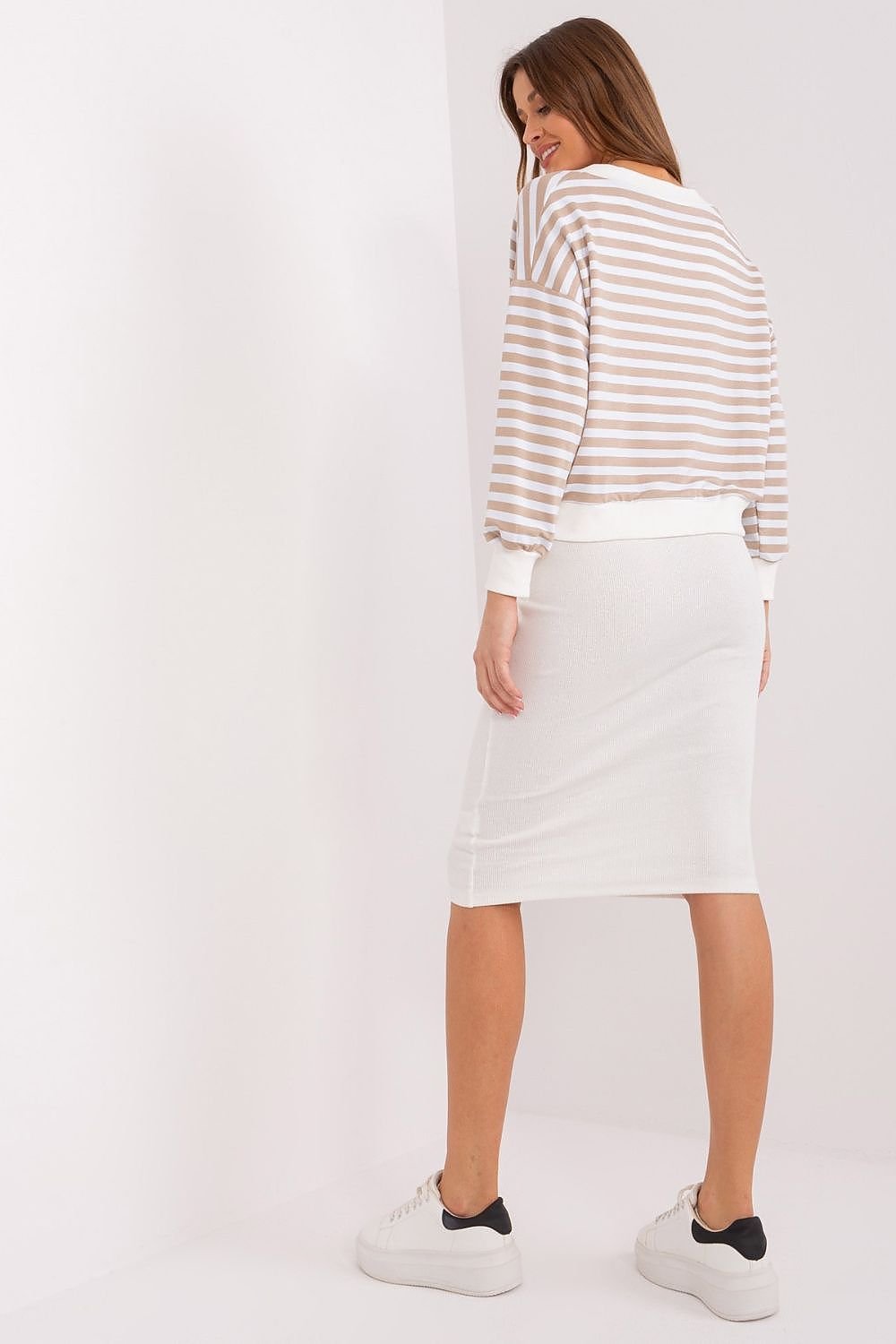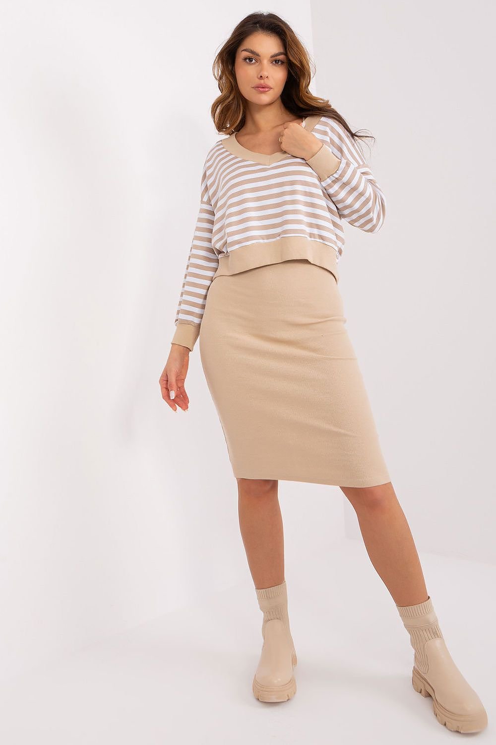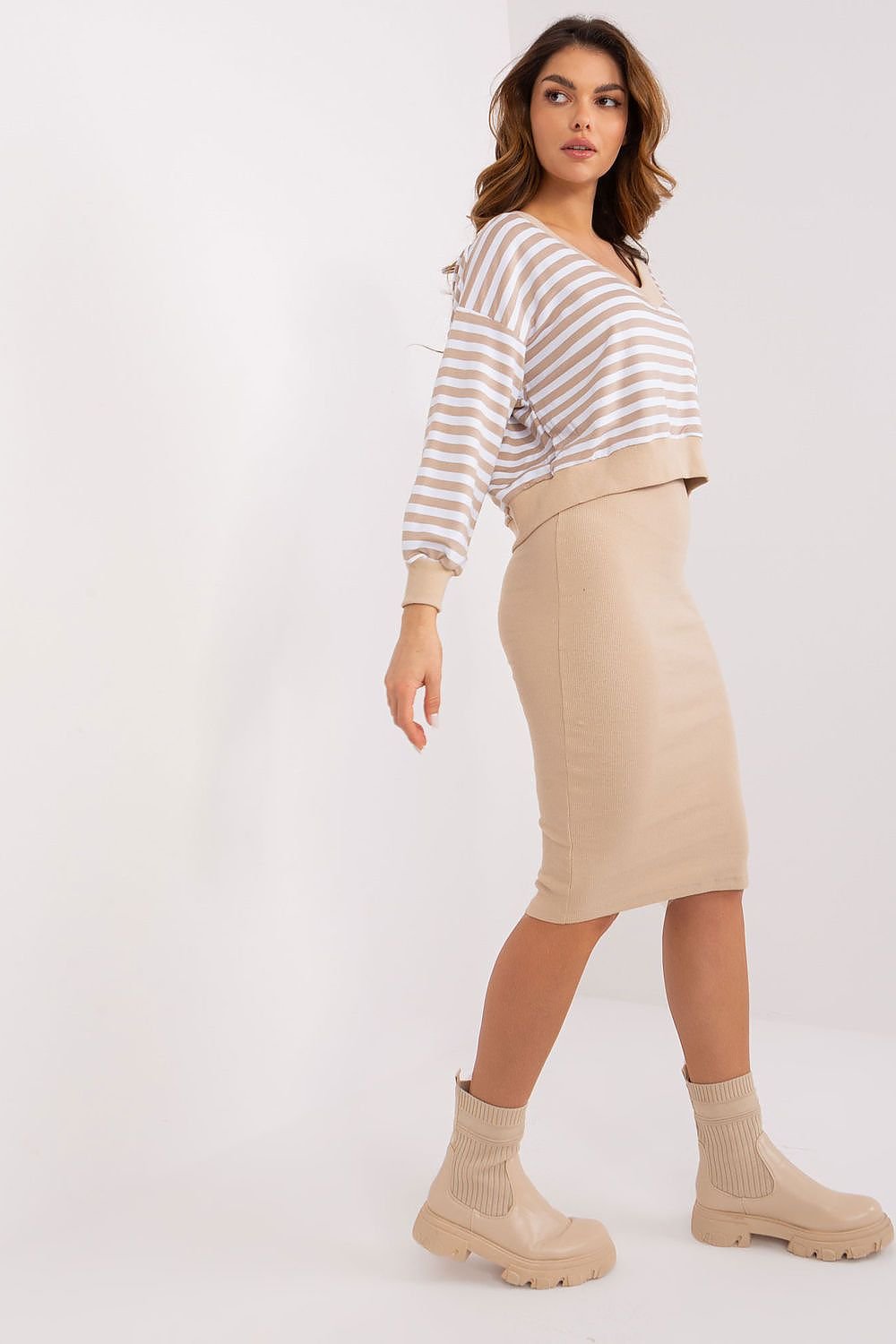The blouse and dress set is a perfect combination of comfort and style, ideal for everyday situations where you want to stay casual and look fashionable at the same time. The dress made of ribbed material adds originality to the set, while the striped blouse gives it lightness and freshness. The dominant material in the set is comfortable and soft cotton, which guarantees pleasure in wearing and adequate breathability. Both the dress and the blouse are kept in a plain pattern, which makes them versatile and easy to combine with other items of clothing. The midi length strapless dress gives the set an elegant look, while remaining a comfortable choice for everyday wear. The heart neckline and round neckline at the dress add subtle femininity, creating a harmonious and balanced composition. A long-sleeve blouse with a heart neckline is a practical addition to the set, allowing you to enjoy casual style on both warmer and cooler days. These elements form a harmonious duo, while maintaining freedom of movement and a pleasant, everyday character. This complete set perfectly combines comfort with fashionable design, making it an ideal choice for everyday meetings, shopping or relaxing walks. The casual style and various elements of the set make it versatile, allowing you to adapt to different circumstances.