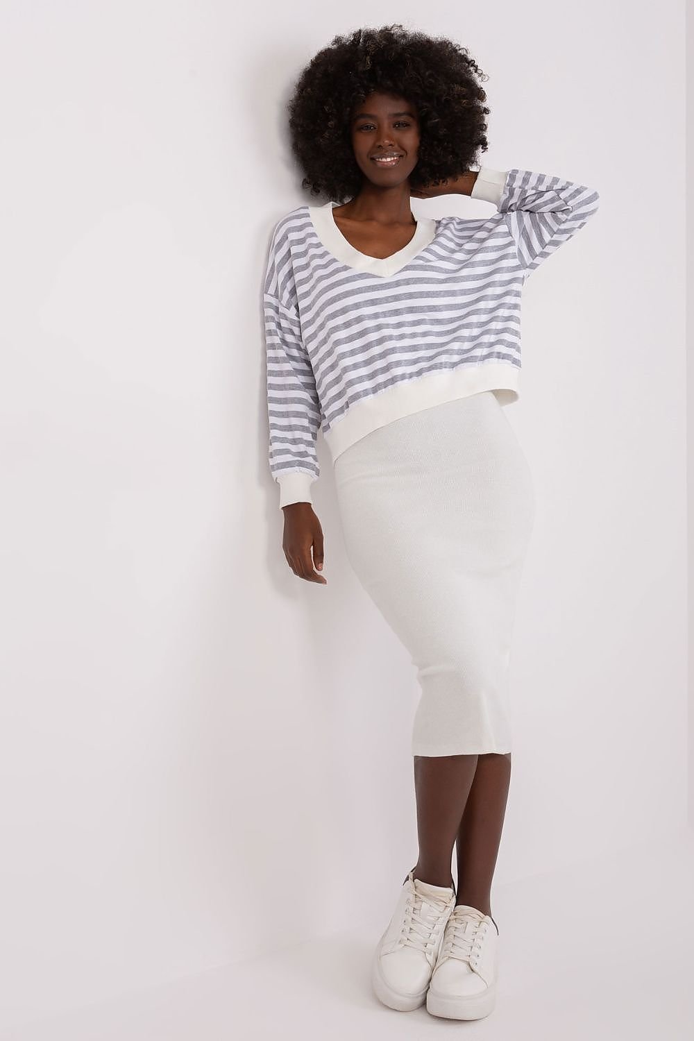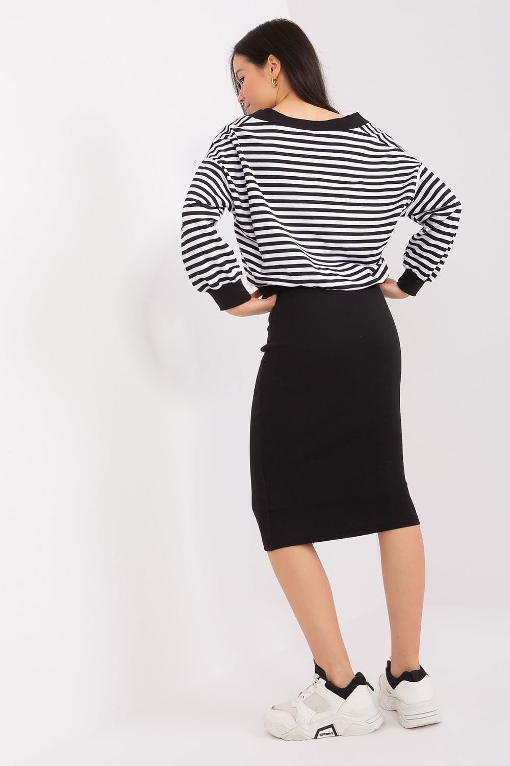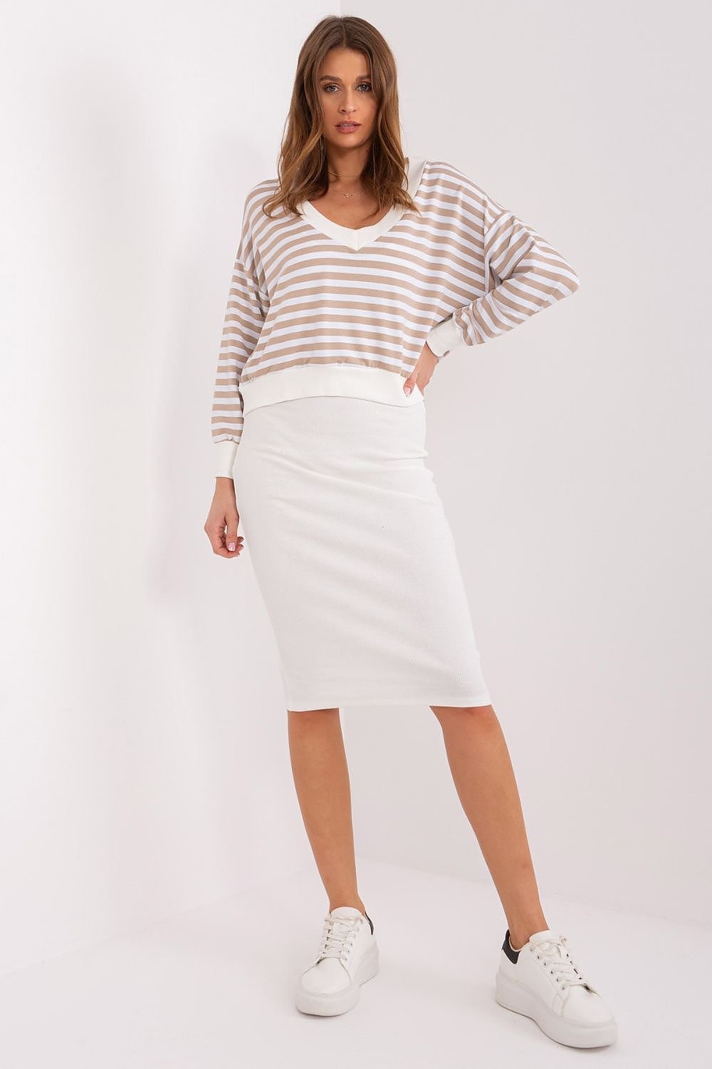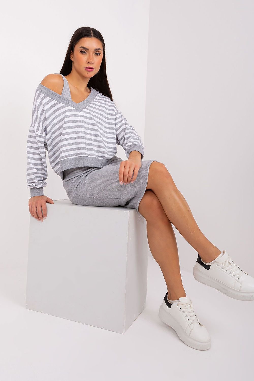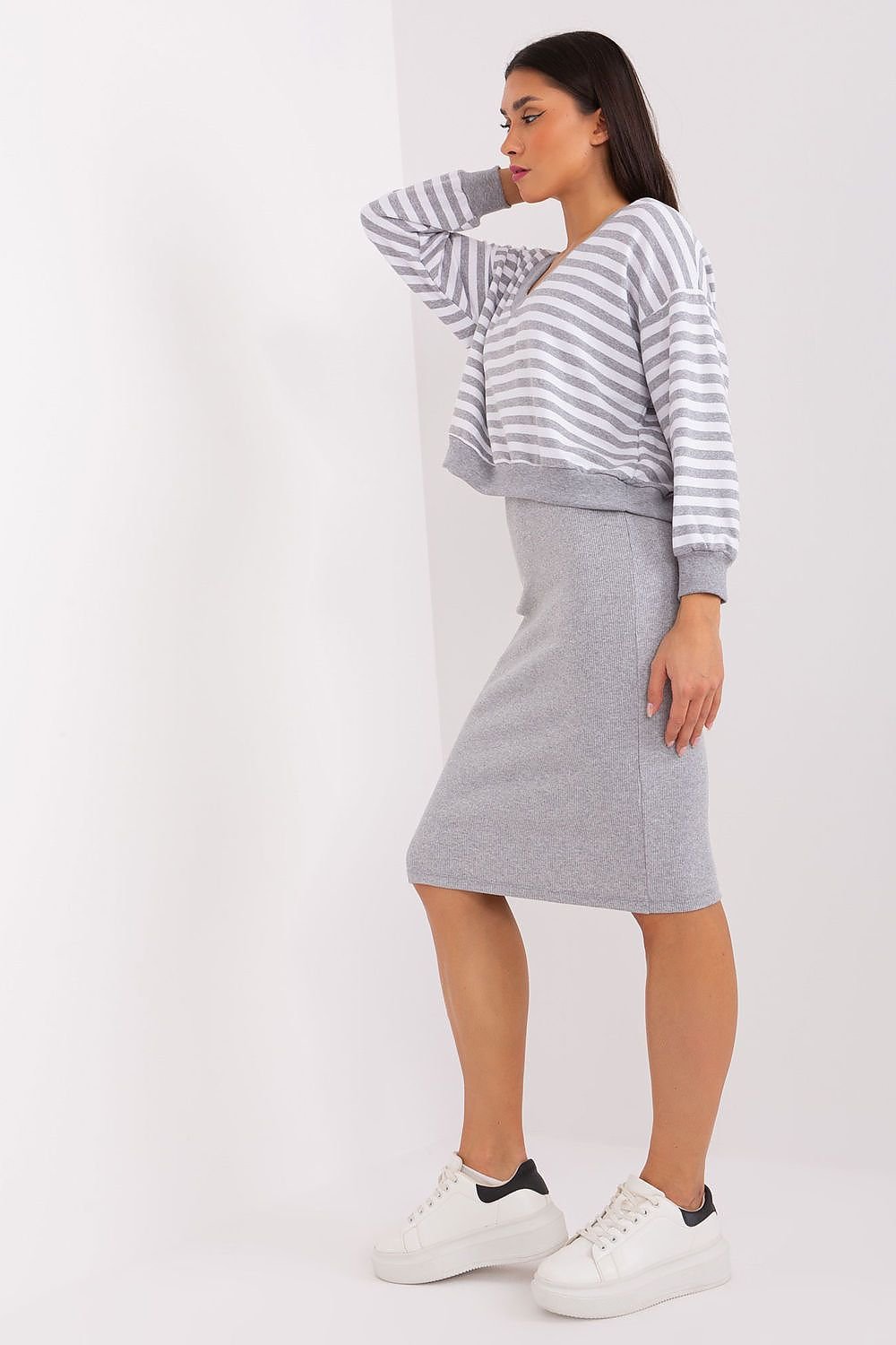 The blouse and dress set is a perfect combination of comfort and style, ideal for everyday situations where you want to stay casual and look fashionable at the same time. The dress made of ribbed material adds originality to the set, while the striped blouse gives it lightness and freshness. The dominant material in the set is comfortable and soft cotton, which guarantees pleasure in wearing and adequate breathability. Both the dress and the blouse are kept in a plain pattern, which makes them versatile and easy to combine with other items of clothing. The midi length strapless dress gives the set an elegant look, while remaining a comfortable choice for everyday wear. The heart neckline and round neckline at the dress add subtle femininity, creating a harmonious and balanced composition. A long-sleeve blouse with a heart neckline is a practical addition to the set, allowing you to enjoy casual style on both warmer and cooler days. These elements form a harmonious duo, while maintaining freedom of movement and a pleasant, everyday character. This complete set perfectly combines comfort with fashionable design, making it an ideal choice for everyday meetings, shopping or relaxing walks. The casual style and various elements of the set make it versatile, allowing you to adapt to different circumstances.