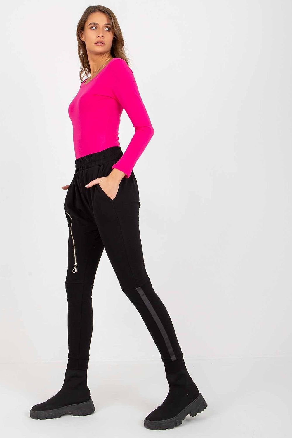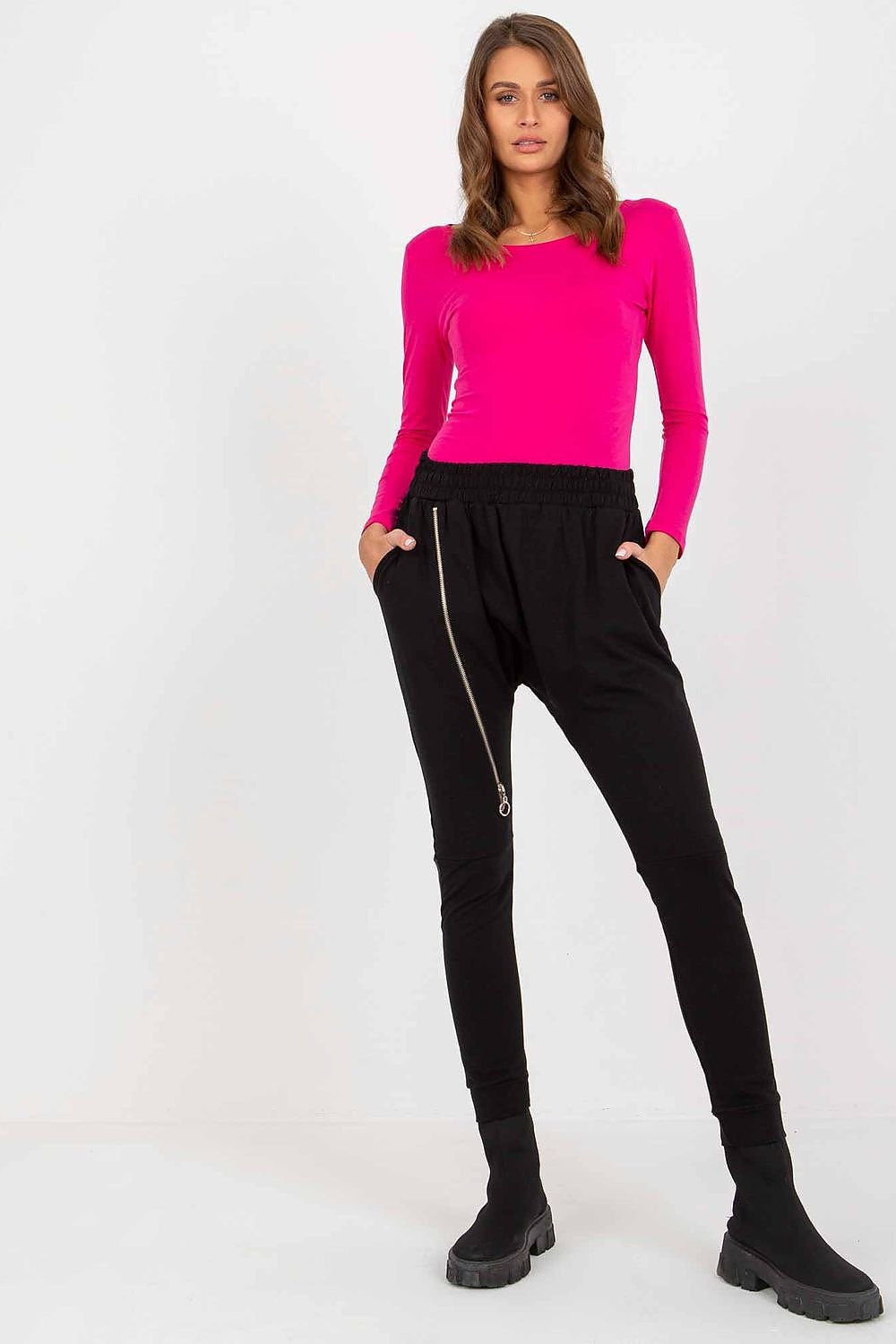 Sweatpants with high waist, elastic waistband and decorative zipper. Slip pockets on the sides.