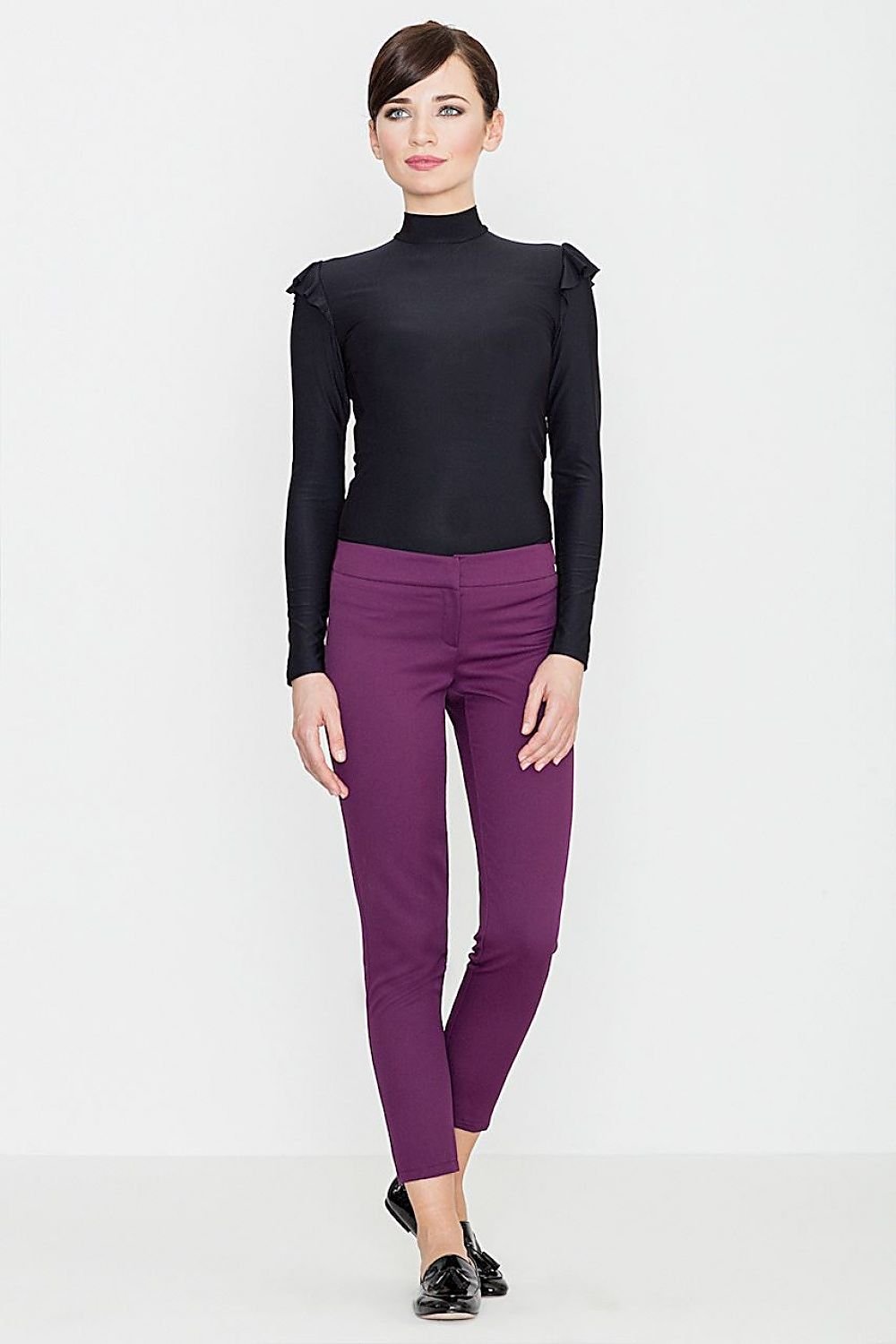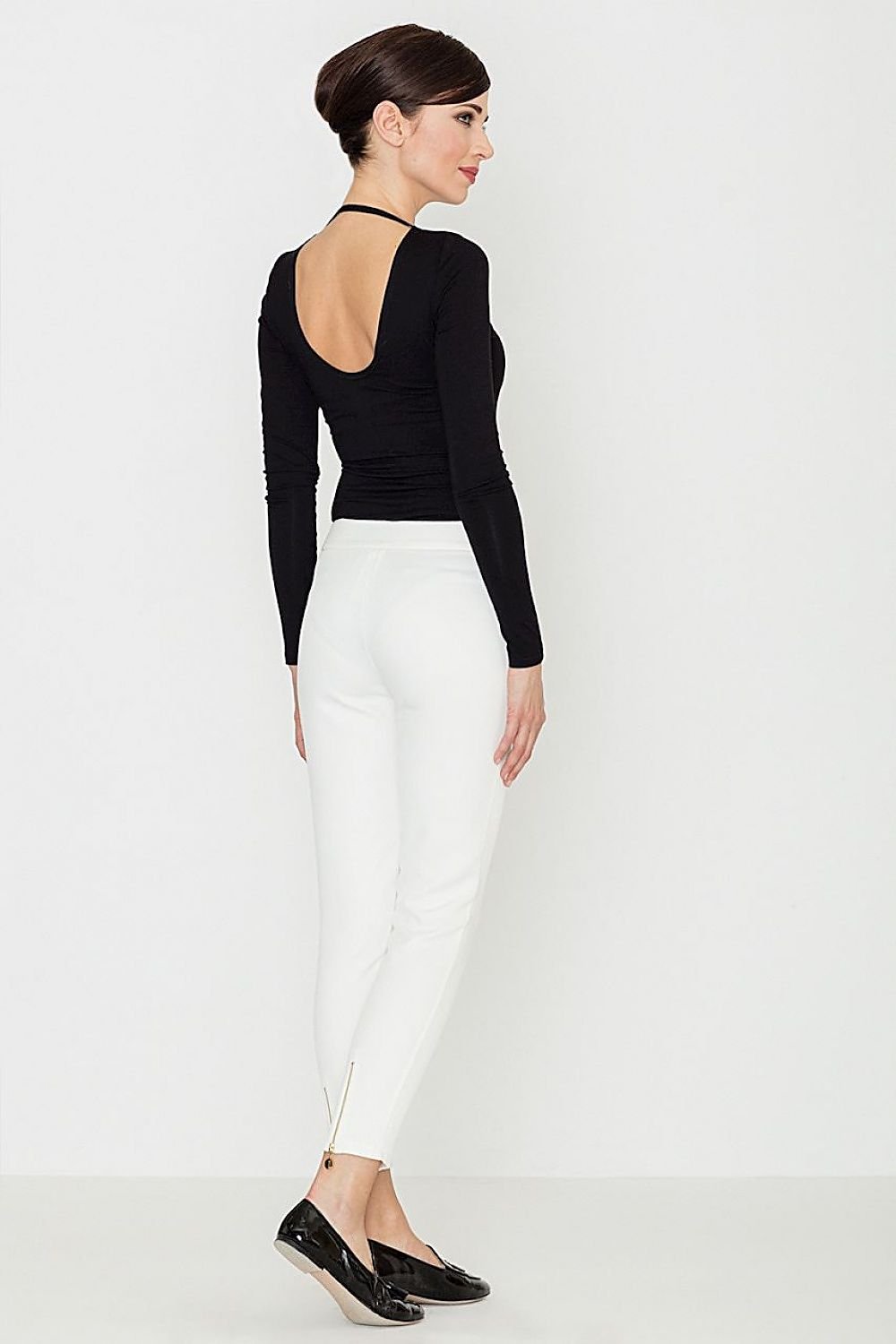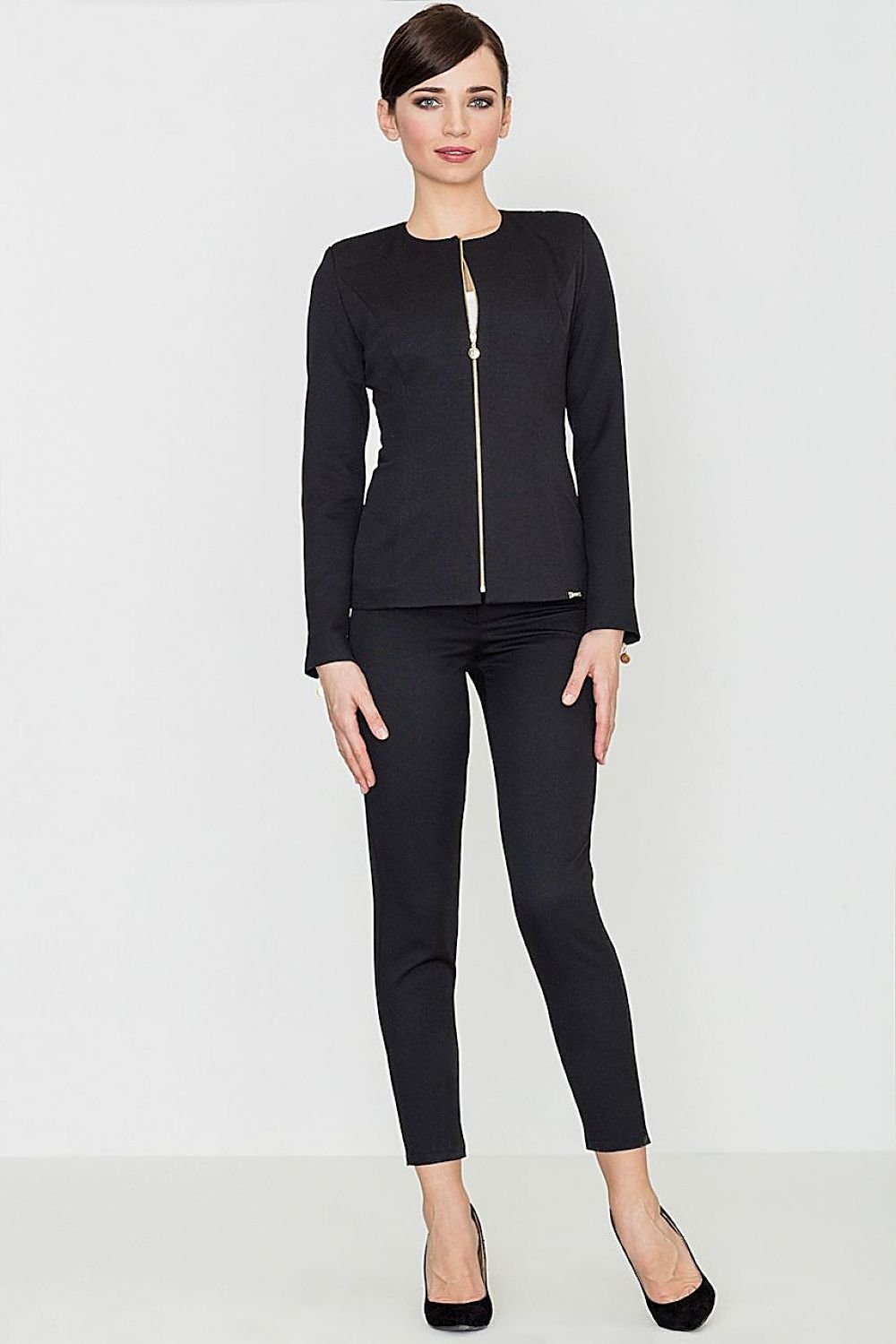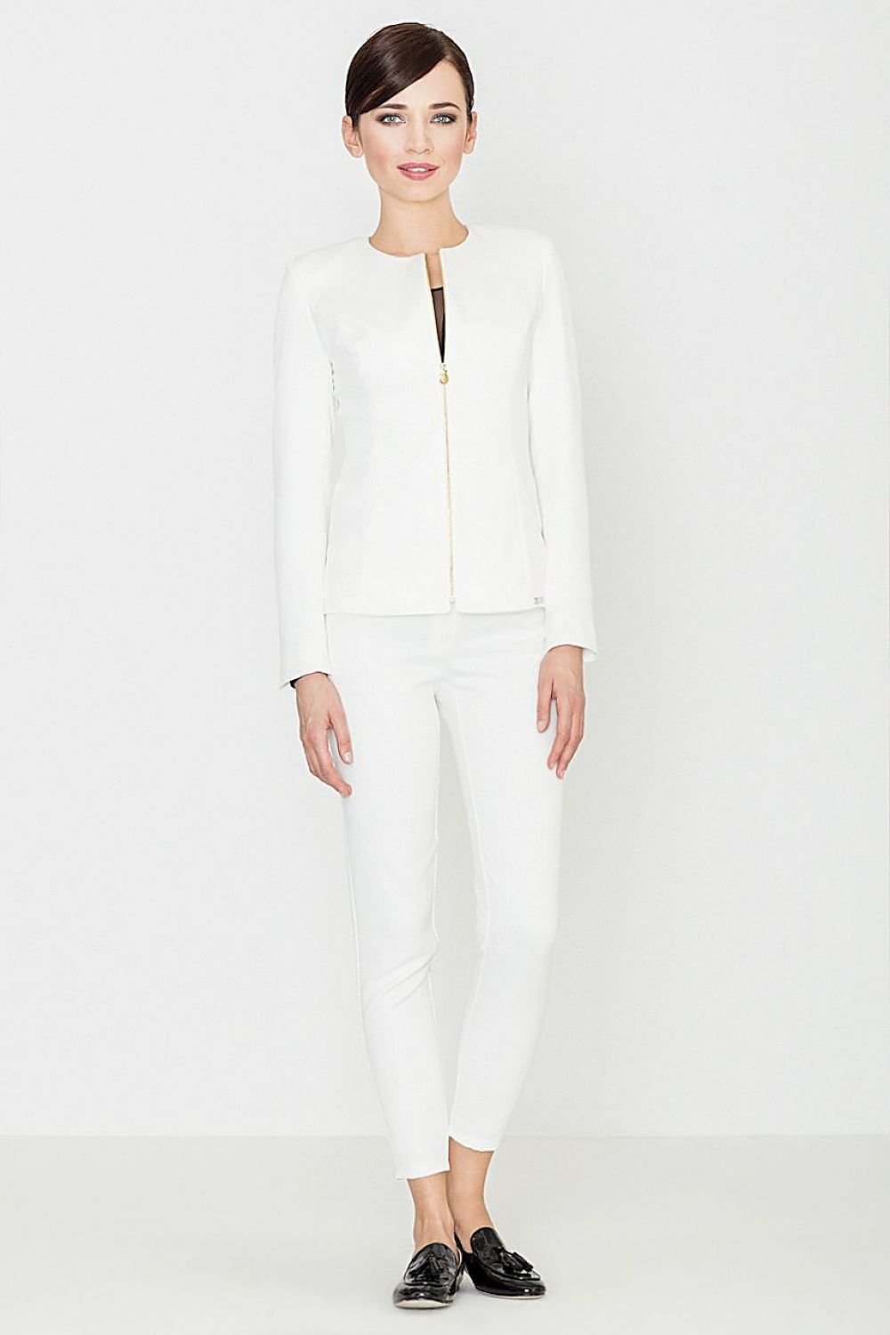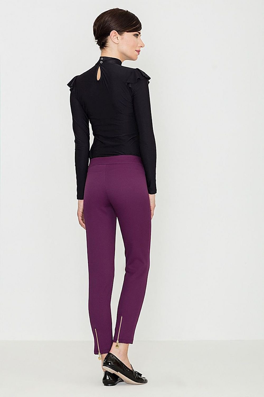 Women's trousers with a versatile character. Made of fabric covered with an embossed pattern. With long, slightly tapered legs. Legs with decorative metal zips. Classic trousers with zip and button fastening.