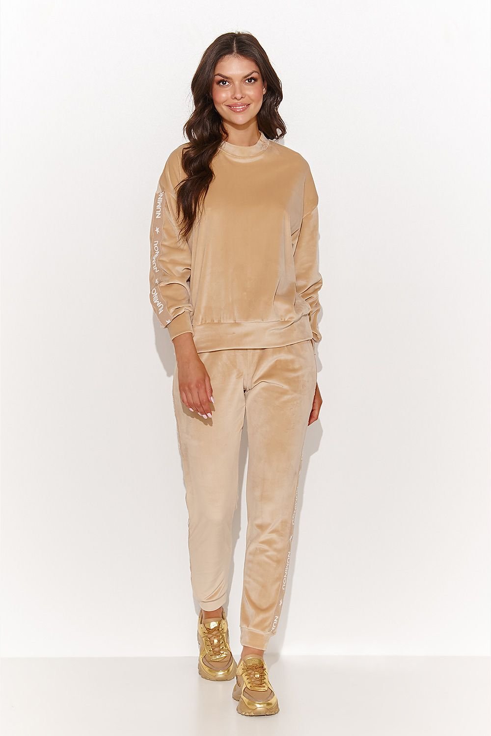 This women's sweatshirt set made of velour knit is a combination of comfort and elegance. The long-sleeved sweatshirt has a fairly built-in round neckline. The simple cut makes the set very versatile. The blouse is worn over the head. Inscription trimmings are present on the sleeves and on the sides of the pant legs. They add a casual style to the set. The pants; straight and tapered, have been equipped with practical slip-in side pockets and ribbed bottoms for comfort. The elastic sewn on the waist line perfectly adjusts the pants to the figure. This tracksuit set is available in two colors: sand and black, allowing you to choose the perfect shade for your closet.